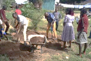 普及員の指導に基づいて、野菜を植えるための畝を丁寧に準備するグループメンバー