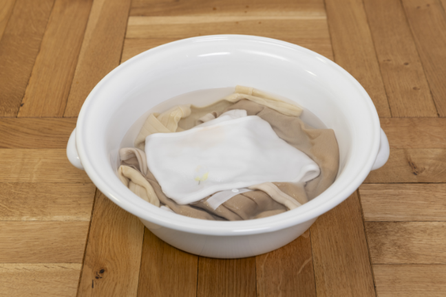 水2Lに「アラウ.酸素系漂白剤」を10g溶かし、15~30分程度つけおきした後にすすぎます。