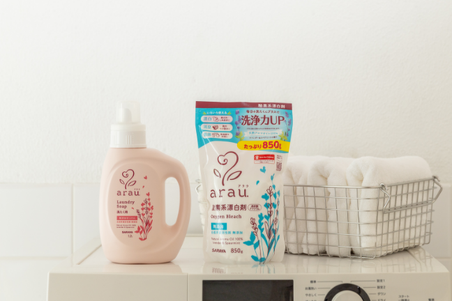 「アラウ.酸素系漂白剤」は、合成界面活性剤無添加で、酸素、水、炭酸ナトリウムに分解されるため、やさしい成分でありながら高い洗浄力を発揮します。また、衣料用だけではなく、多用途に使えます。