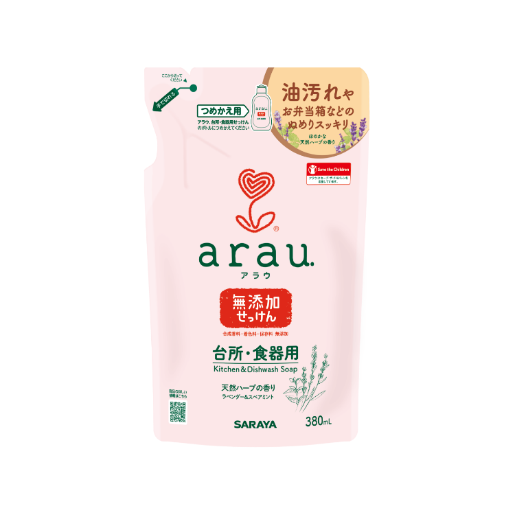 洗浄成分は100%植物生まれのせっけんで、合成界面活性剤をはじめ、合成香料、着色料、保存料は無添加。家族みんなの食器洗いにお使いいただけます。