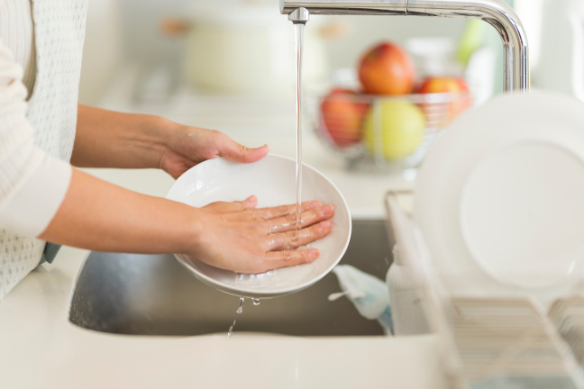 A.流水の場合、食器および調理用具は5秒以上、野菜・果物は30秒以上、ため水の場合は水を替えて2回以上すすいでください。