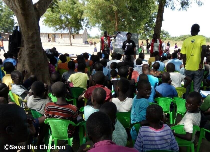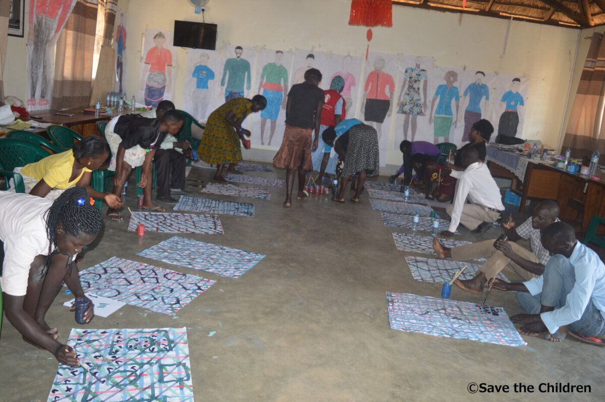 振り返り会議では、「こどもひろば」での活動に参加する子どもたちが、活動に対する要望について積極的に発言しました。また、セーブ・ザ・チルドレンのスタッフが、スタッフに対して、絵を描くことを通した子どもたちの心理的ケアについての研修を実施しました。