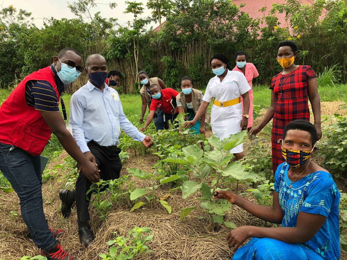 カルサンダラ準郡の保健施設では、庭の一角を耕しデモンストレーション用の家庭菜園を作っています。ナスやホウレンソウ、トマトなど栄養価の高い野菜を栽培し、診療に来る母親たちに紹介しています。普段、家計が逼迫していることから、一回の食事がバナナのみあるいはとうもろこしの粉を水に混ぜて練ったポショ(現地語)のみ、という家庭が少なくありません。母親たちには「できる範囲で自家栽培し、一回の食事で3色摂るように。」と指導しています。バナナは黄色、ポショは白色ですが、ナスであれば紫、トマトは赤、ホウレンソウは緑といった色があり、栄養といった難しい言葉を使わずとも、バリエーションを彼女たちに理解してもらえるよう努めています。
