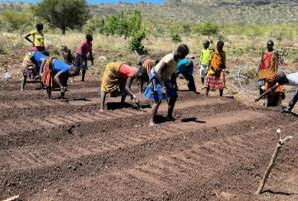 普及員の指導に基づいて、 野菜を植えるための畝を準備する農民たち